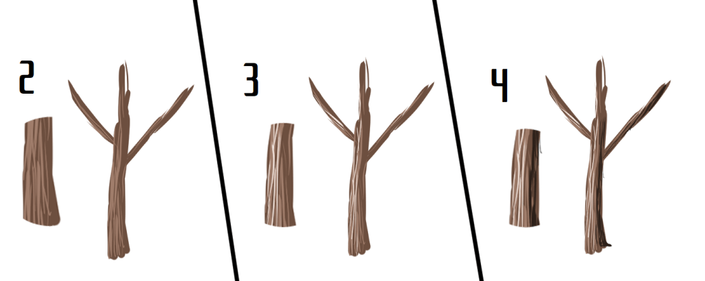 Step 2-4: The next step is to highlight the tree. For this, decide which side you want the light to be hitting. Then take the same shade you used for the trunk, and lighten it. With this, paint some vertical, disconnected lines sprawling up and down the light side of the tree. For step three, take the same color that was used for the previous step and lighten it further until it’s almost white. Use this to highlight the very edge of the light side of the tree. For step four, take a darker shade of the trunk’s base color, and paint some vertical, disconnected lines on the shadow side. Remember to paint a bit of highlight on the limbs. Also, be sure to leave the limb on the shadow side without much highlight, as it naturally wouldn’t receive much.