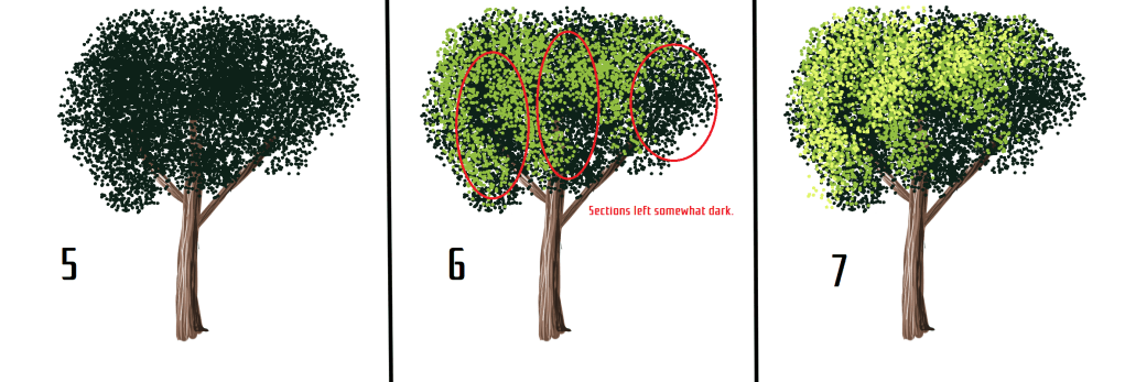 Step 5-7: The fifth step is to paint the leaves. On the digital painting software I used, I did this by using an air-brush type tool. In theory, you could probably just dab a bunch of dots to get a similar effect. Or if you’re painting on a canvas, try bundling cotton swabs together and using the tips to dab on the leaves. For the base layer, use a green that’s quite dark. And try to avoid painting a perfect circular shape to ensure the tree looks natural. Once this is done, the next step is to pick a light greenish color and go over the side where sunlight would be hitting. Be careful with this step- try to layer it on. If you look closely at the example, you’ll notice there’s some dark spaces left in between the highlights. Once you’ve done that, lighten the highlight color again. This time you may want to make it a bit more yellow. With this, highlight just the edges of the other leaf highlights. Just be careful that you don’t add too much that you cover your original highlights.