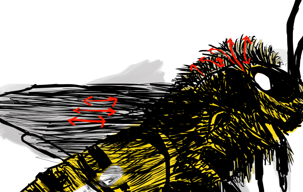 Another thing that I’ve found when drawing from reference is to avoid being overly concerned about creating perfectly straight lines. In fact, I once attempted to digitally draw a biplane. Since I was doing it digitally, I decided to use the line tool so I’d have perfectly straight lines for the wings and other sections. To say the least, I didn’t finish that piece because it just looked too stiff. Plus, because I was overly reliant on the precision line tool, I wasn’t really training myself to draw lines, much less enjoying the process that much. None of this is to say never use a ruler, or a precision line tool; especially if you like the look it helps you to create. But try to draw without these things, especially if you’re drawing something from nature. For instance, it’s not likely that you’ll find a tree in which every one of its limbs is perfectly straight. Nor is it likely that you’ll find a cat that has all its hairs perfectly groomed in one direction. That’s not to say it’s all haphazard- most limbs on a tree branch outward. It’d be a bit unnatural to see a huge branch in the shape of a zigzag. The same thing goes with fur- even though it’s not perfectly straight, the clumps of fur usually follow a general direction. (As an example of this- notice how the bits of texture/hairs in the bee sketch follow a general direction- they aren’t random crisscross strokes.)