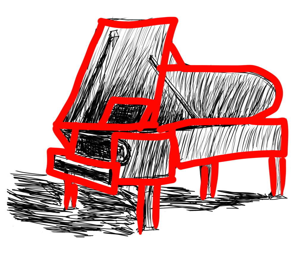 (When I originally sketched this piano, I wasn’t simplifying the shapes. So it took several times for me to get the curve of the piano’s cover. If I had outlined the simple shapes, I would’ve had a guide that would’ve made it much easier.) And if you don’t want the extra lines that accompany the effort of breaking something down into simpler shapes, just try to make a light sketch in which you can erase the extra lines afterward. If you’re drawing with a more permanent medium, you might be able to draw out the simpler shapes on one piece of paper, and then overlay another piece of paper to copy the overall shape.